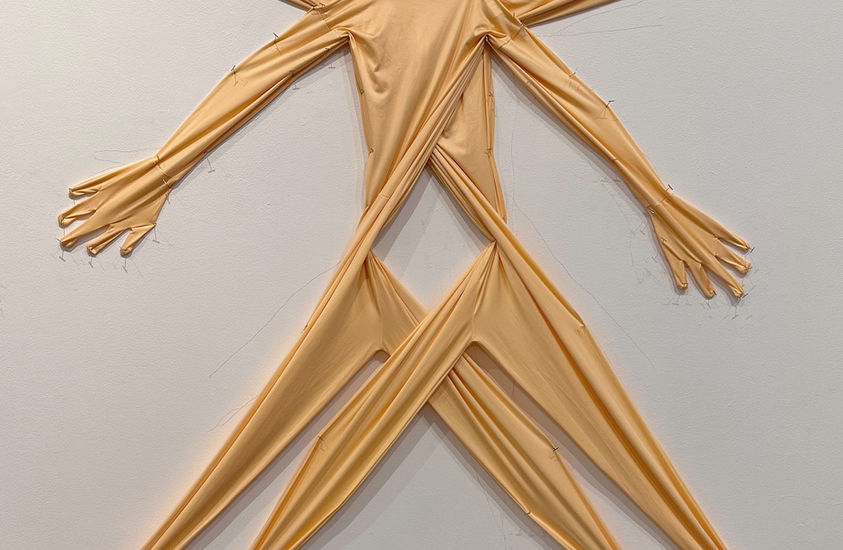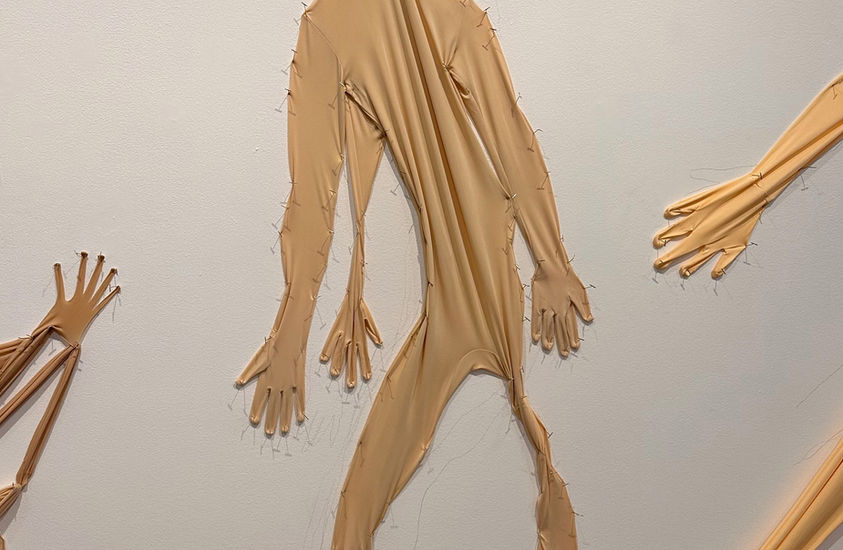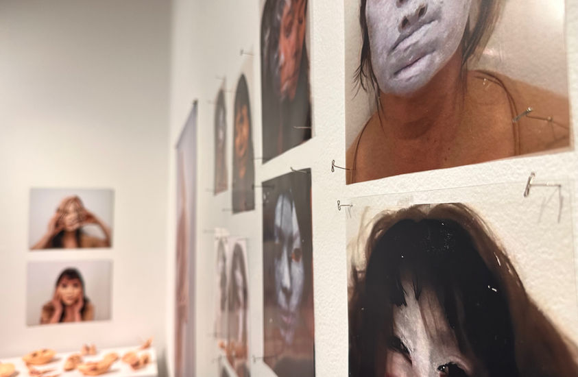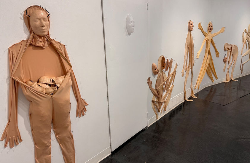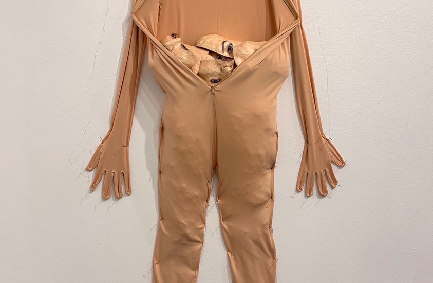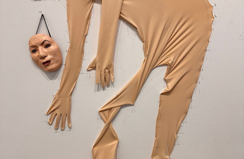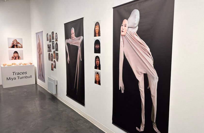 "Extending this language of masking to the full body, traced outlines and empty “skin-suits” on the gallery walls act as proxies, suggesting forms that were once inhabited but are now hollow, suspended or pinned in place. These self-portraits, along with life-sized photographs and video performances, function as fragments or echoes, tangible traces of identity in flux, caught between presence and absence. Together, these elements form an environment where body, image and memory overlap: an archaeology of the self in transformation. Traces invites viewers to reflect on how identity endures through what is left behind."