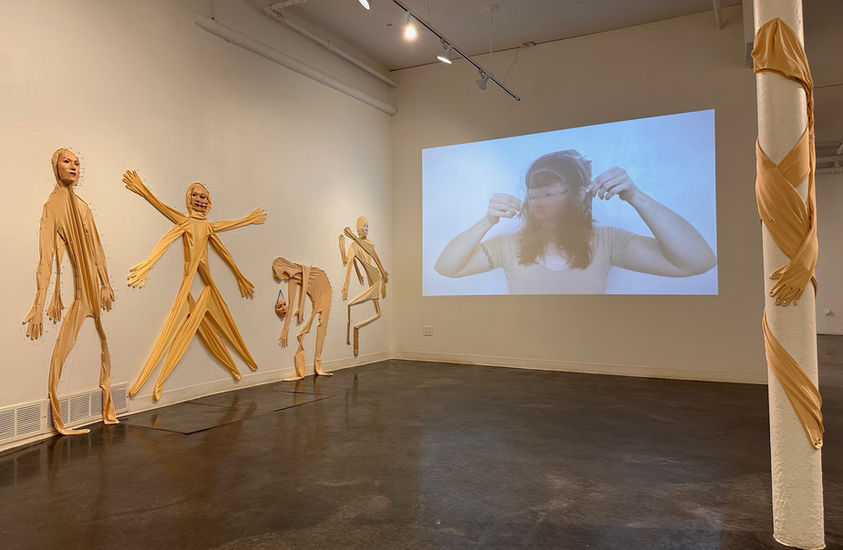 This exhibit is a combination of self-portrait masks, sculptures, origami, portraits, painting/collages, skin-suit dolls, video performances and video projection.
